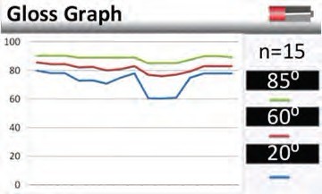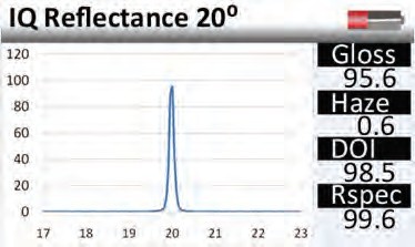 鏡向光澤度-該儀器顯示的是表面17-23°的反射面。圖中曲線的形狀描述了光和表面的相互影響。接近鏡面的曲線的急轉彎說明了表面光滑的高反射。
